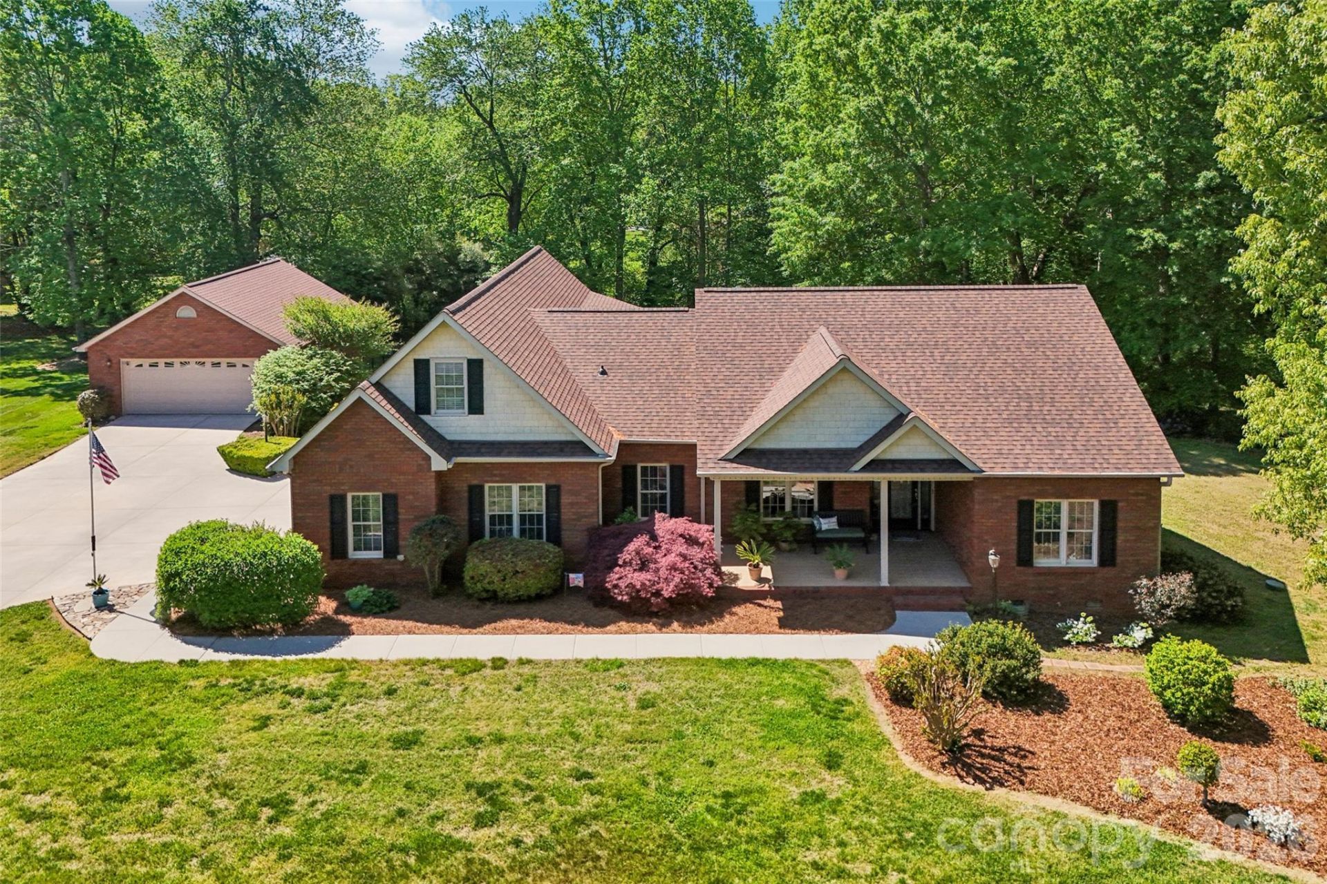 Welcome to this amazing home sitting on 1.5 acres with a fenced private backyard in Spring Forest. An all brick home subdivision in Cool Spring/North Iredell school districts. 2 car garage and a detached 2 car garage with floored storage over it and a half bath. 3 bedroom 2.5 bath ranch plan with bonus room with a closet over the garage. Immaculate home with a split bedroom plan, eat-in kitchen and formal dining room. Hardwood floors, granite countertops and stainless steel appliances. New roof! Covered back porch and a large deck with sun screens. Beautiful landscaping with rhododendrons, azaleas, eucalyptus and banana trees!